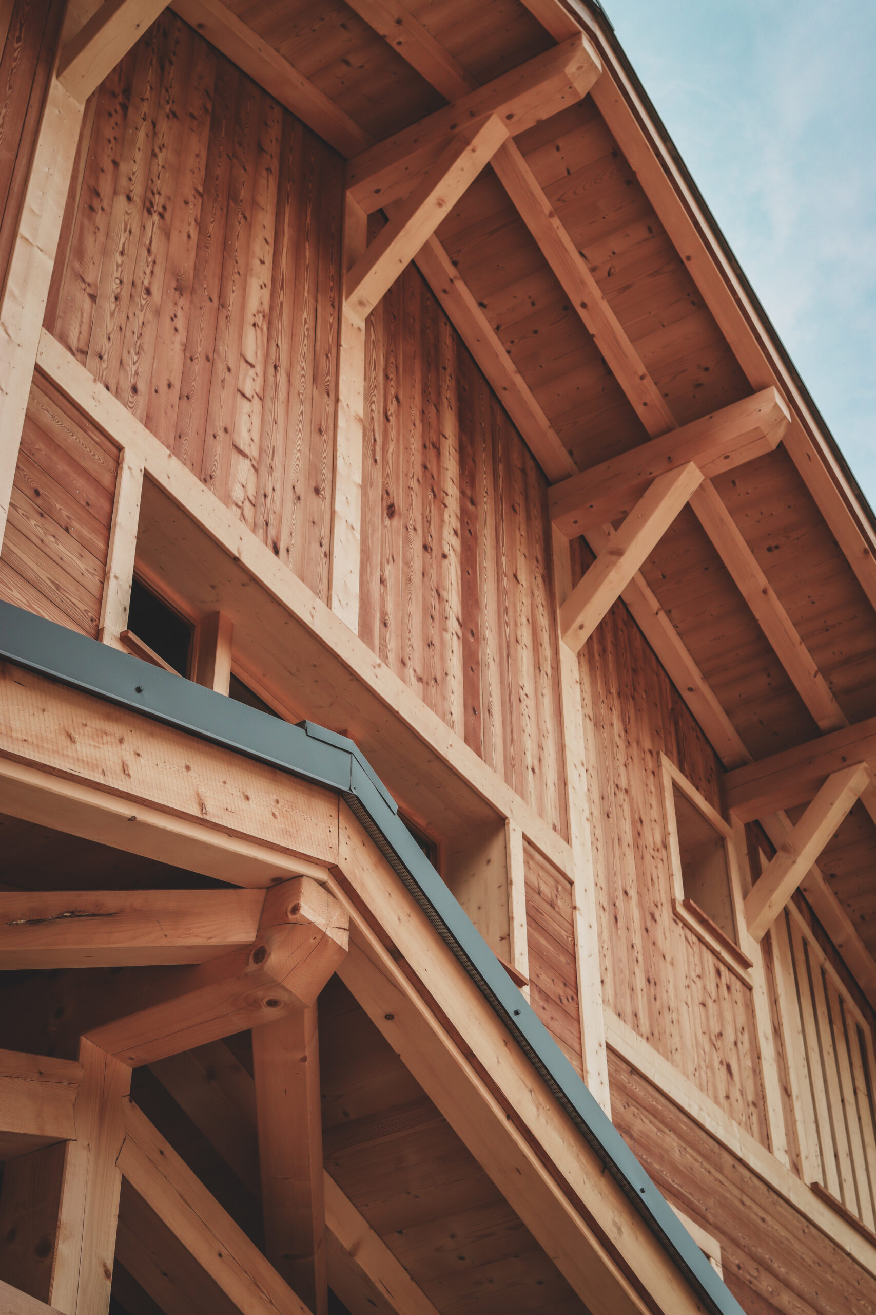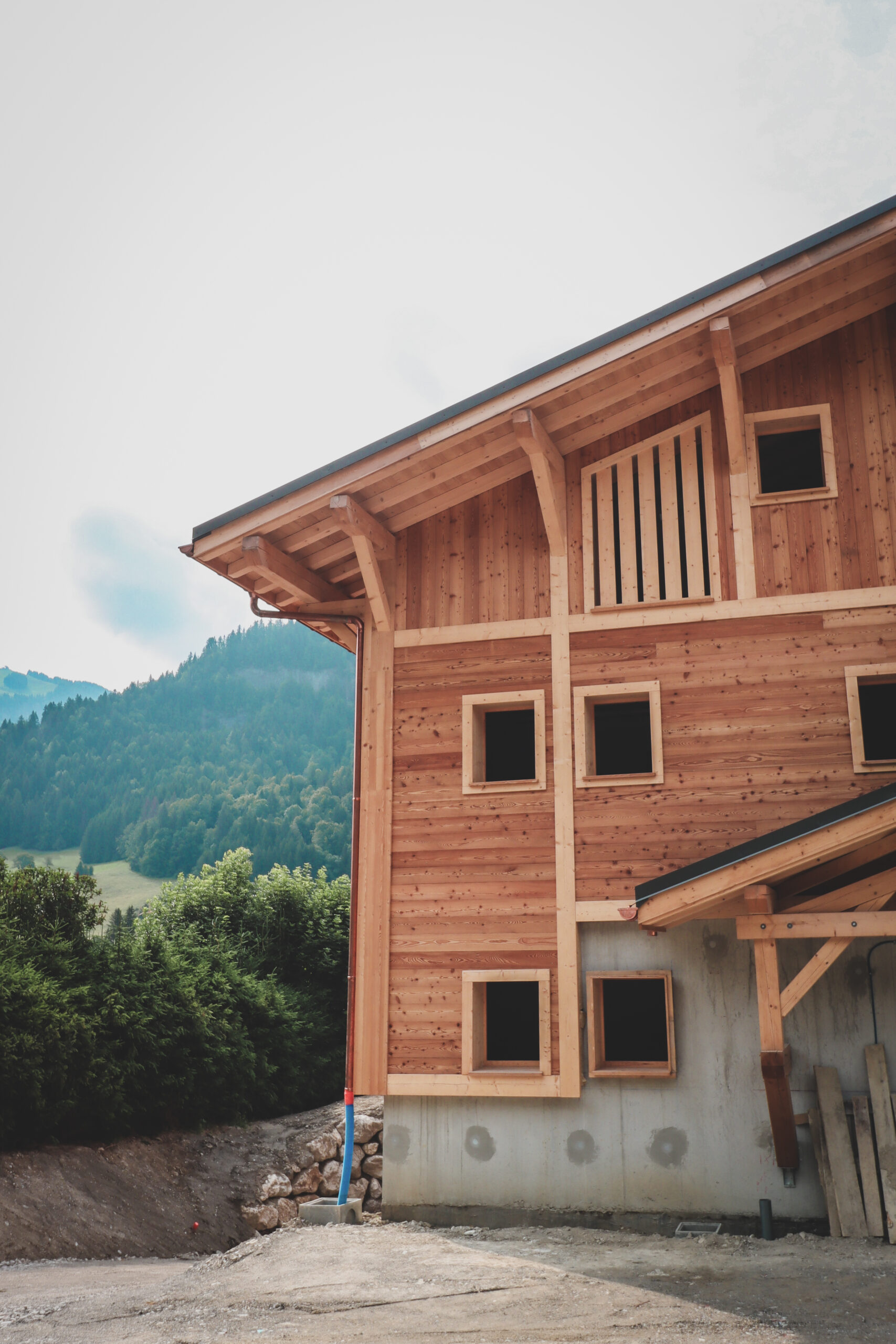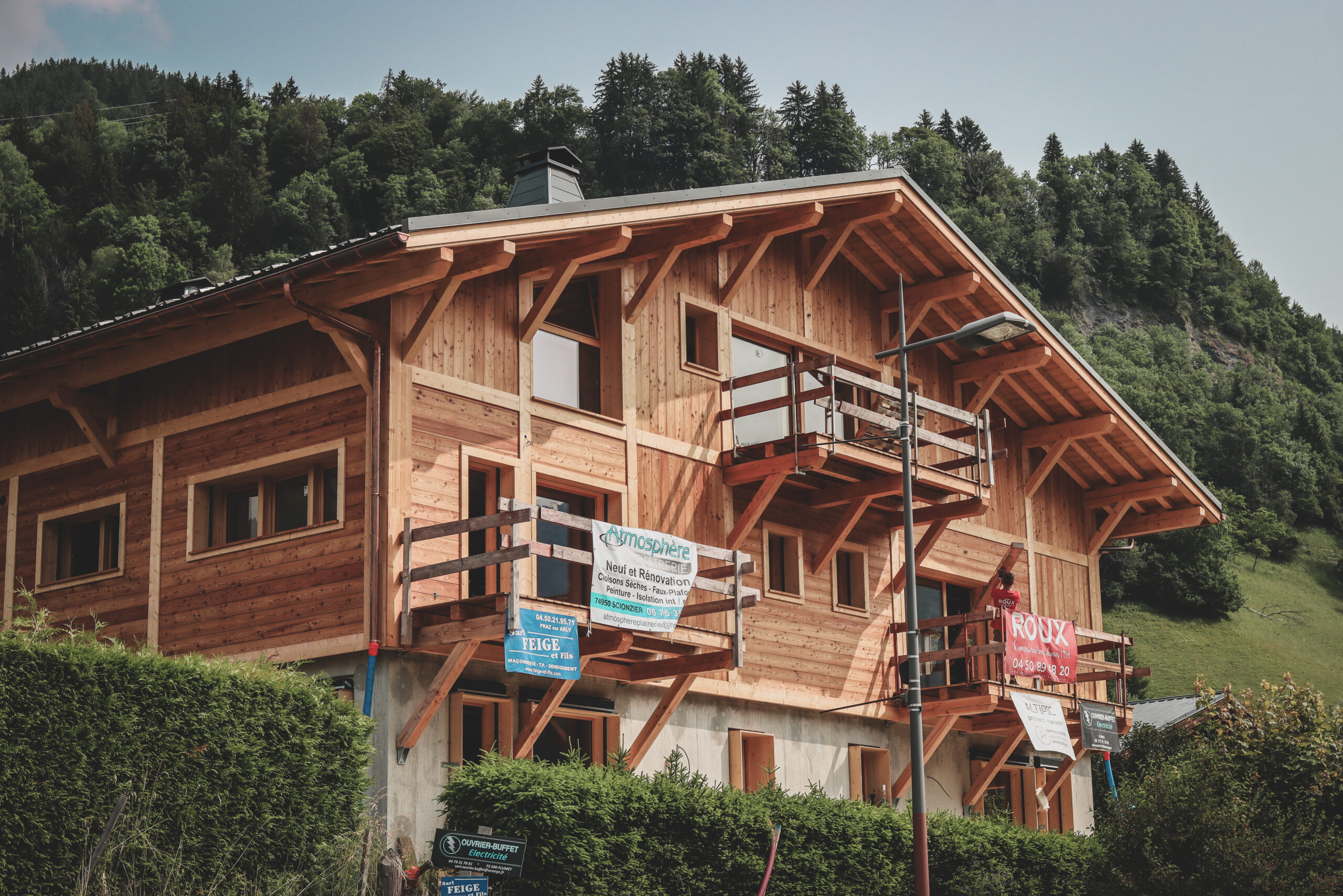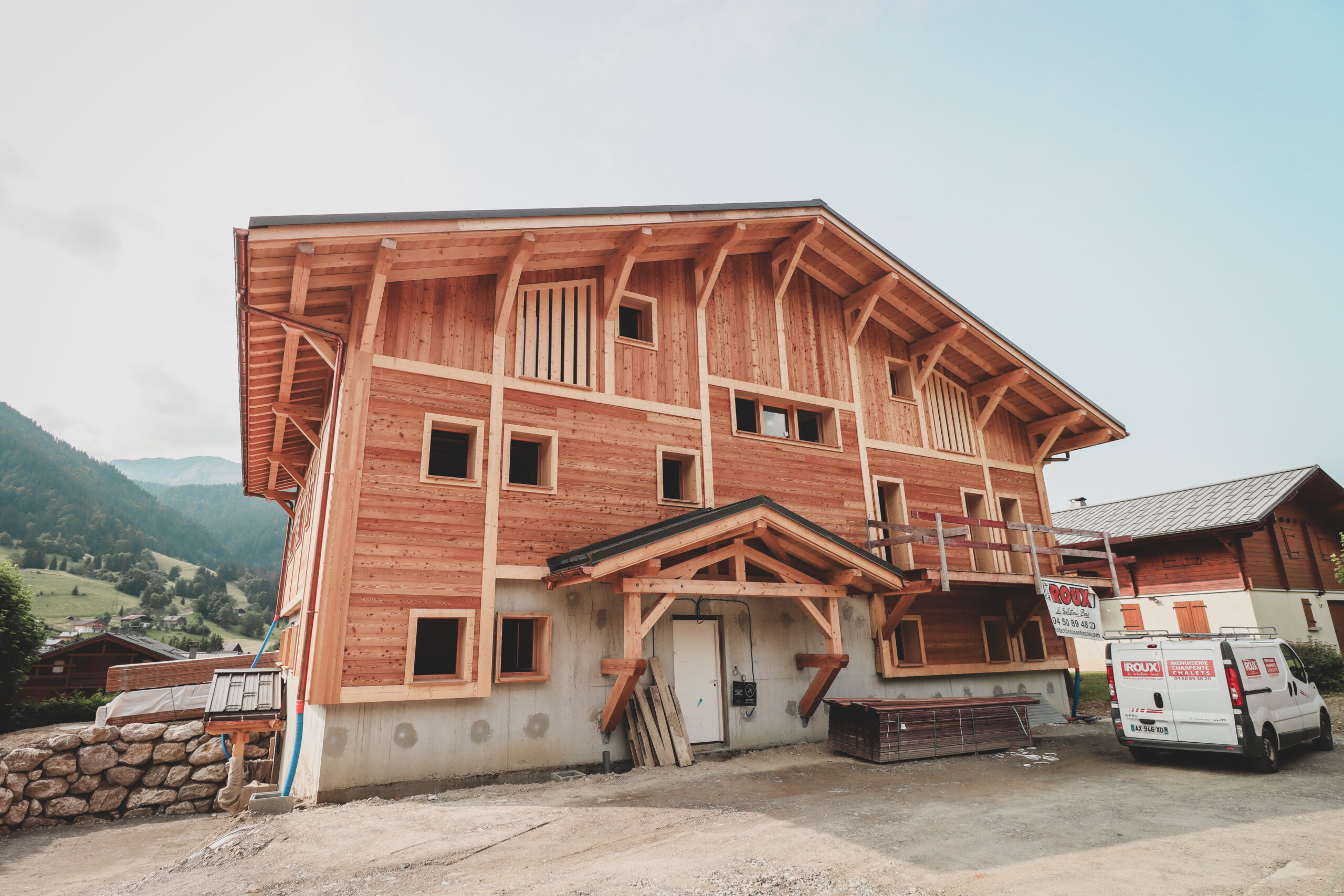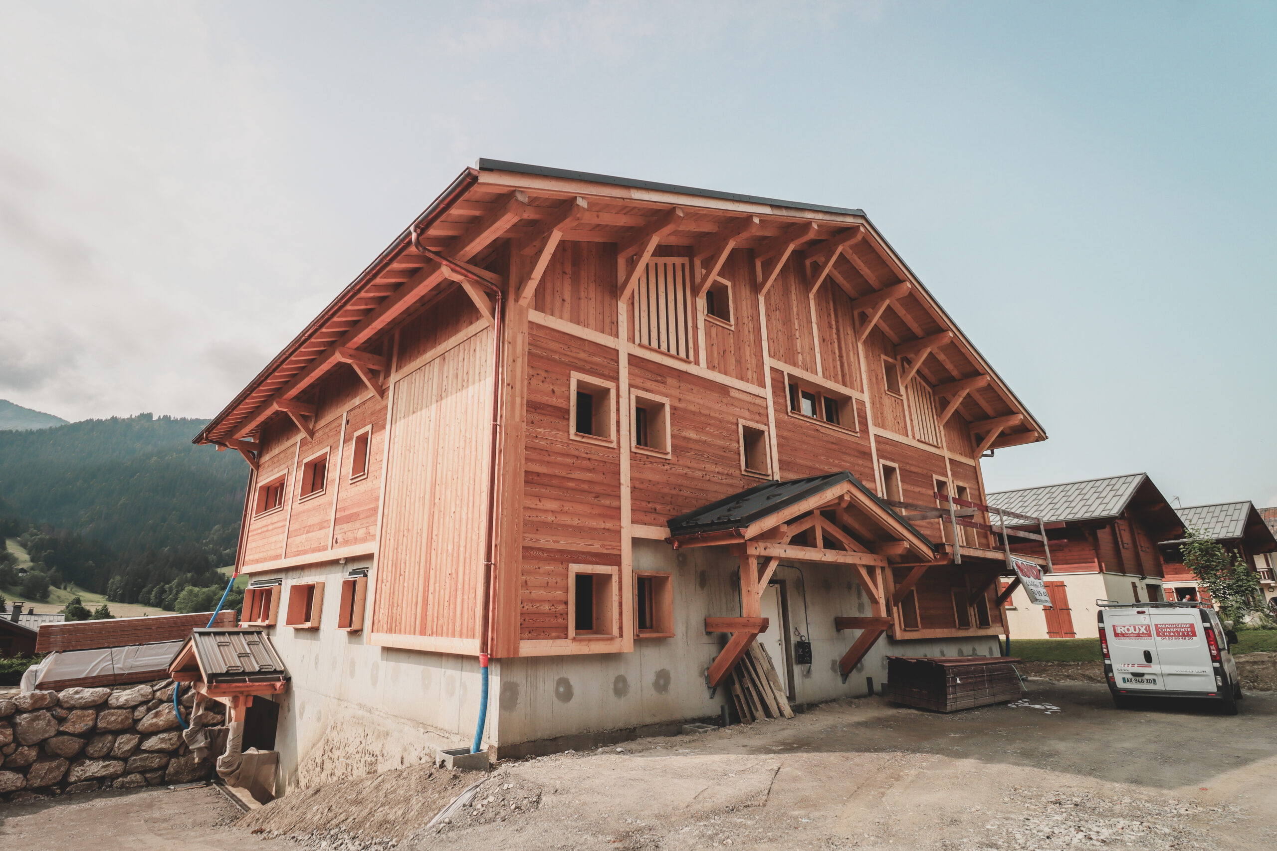 Les façades en mélèze étuvé brossé reprennent les codes du style local tout en jouant avec de légère asymétrie afin d’apporter une touche plus contemporaine.
